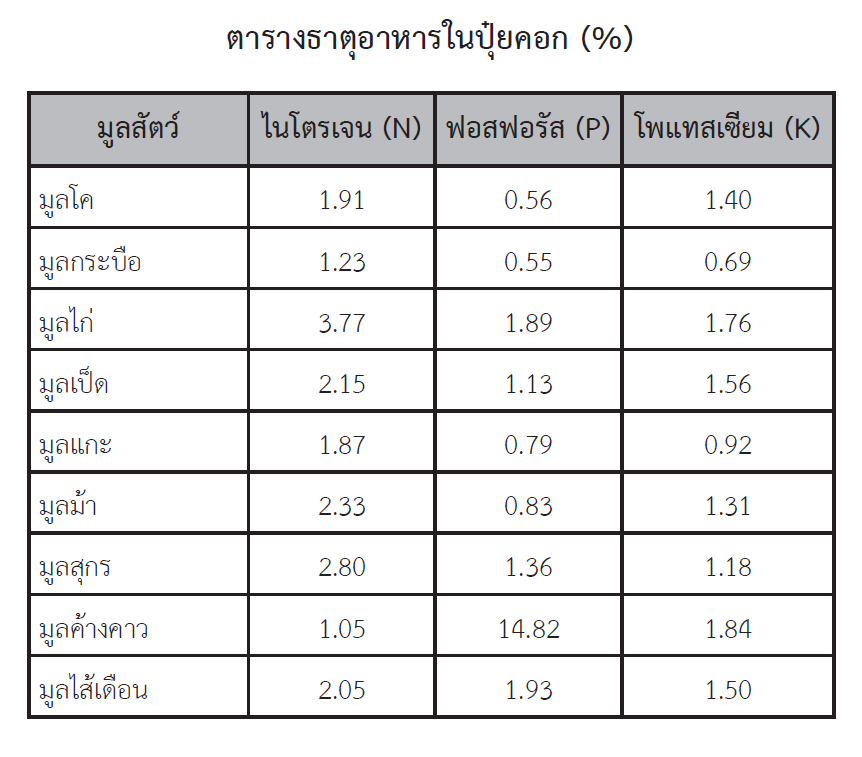 ดังนั้น เราจำเป็นจะต้องพิจารณาถึงความต้องการของพืช และพิจารณาถึงสภาพของดิน แล้วจึงมาพิจารณาถึงปุ๋ยคอกมูลสัตว์ที่จะใช้ เราไม่จำเป็นต้องเลือกใช้มูลสัตว์เพียงชนิดเดียวก็ได้ เราสามารถใช้มูลสัตว์หลายชนิดรวมกัน เพื่อให้ได้ธาตุอาหารที่สมบูรณ์ที่สุด ไม่ใช่เห็นเขาว่ามูลไก่มีธาตุอาหารมากที่สุด ก็เลยใช้แต่มูลไก่ อันนี้เราอาจจะต้องคิดใหม่ เพราะมูลไก่มีธาตุอาหารหลักสูงเพียงไนโตรเจนเท่านั้น แต่ถ้าเราจะลองเอามูลไก่มาหมักผสมกับมูลค้างคาว ที่มีปริมาณธาตุฟอสฟอรัสที่สูงมาก เราก็จะได้ปุ๋ยคอกที่มีประสิทธิภาพไม่แพ้ปุ๋ยเคมีสูตร 15 -15 -15 เลยทีเดียว